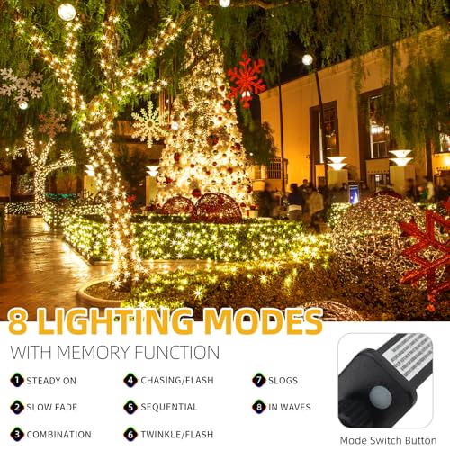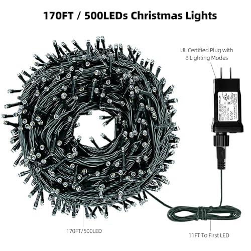 Specification: 170FT 500 LED Christmas Lights Outdoor Indoor, Waterproof Christmas Tree Lights for Christmas Decorations with Timer, 8 Modes Memory Function (Warm White)
