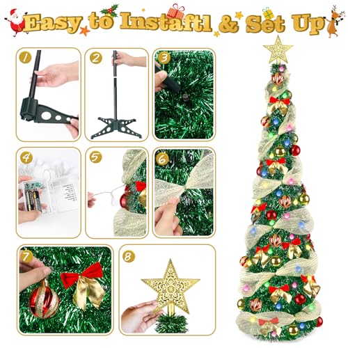 5FT POP UP TINSEL CHRISTMAS TREE WITH 8 LIGHTING MODES: This collapsible Christmas tree includes: Bright green artificial Christmas tree, 30 LED color lights, 30 balls(3 different style), beige ribbon, tree top bow and star. The LED light has 8 modes(Combination, Waves, Sequential, Slow Glow, Chasing/Flash, Slow Fade, Twinkle/Flash, and Steady On) you can DIY adjust according to your own preferences. This pop-up Christmas tree set is bright and exquisite enough. Full of Christmas atmosphere gift Perfect for homes, offices, or parties (Need 3 x AA batteries(batteries are not included)
