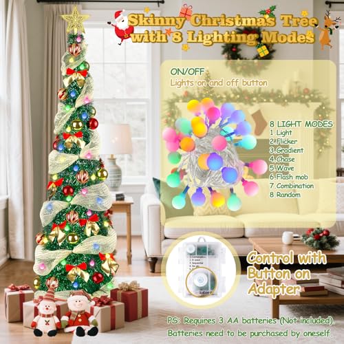 Specification: 5FT Pop Up Christmas Tree with Lights, Collapsible Tinsel Pencil Christmas Tree with 8 Lighting Modes and Red Gold Decoration, Skinny Artificial Xmas Tree for Home Office Apartment Holiday Party Decor