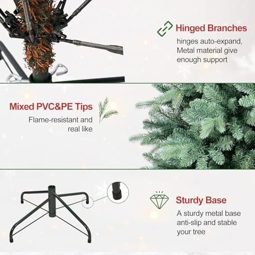 👍 High-quality materials: The branches of this xmas tree are made of metal hinges and flame-retardant PVC & PE, supported by a cross-metal base, offering exceptional durability and stability. You no longer need to worry about branches breaking due to excessive decorations, allowing you to hang more ornaments to create a lively festive atmosphere.