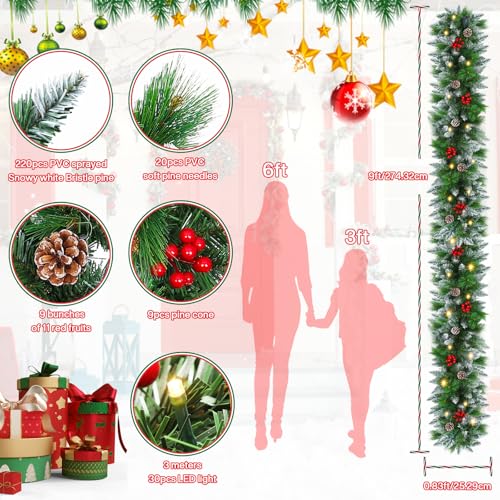 Christmas Garland with Lights – 9FT Pre-Lit Flocked Garland with 30 LED Bulbs, Red Berries, Pine Cones, Artificial Pine Battery Operated Garland for Fireplace, Staircase, Indoor & Outdoor Decoration