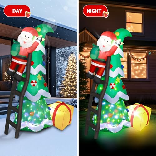 【Classic Christmas Design】: Bring the magic of Christmas to your home with this 7-foot inflatable featuring Santa Claus climbing a beautifully decorated Christmas tree, complete with a large gift box. This lively and charming decoration is sure to catch the attention of family, friends, and neighbors, creating a joyful and inviting atmosphere for the holiday season.