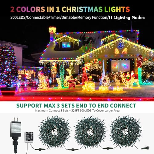 Specification: Color Changing Christmas String Lights Outdoor Indoor, 108FT 300 LED Warm White Multi Color Fairy Light, END to END CONNECTABLE, Waterproof Christmas Tree Lights with Timer Remote