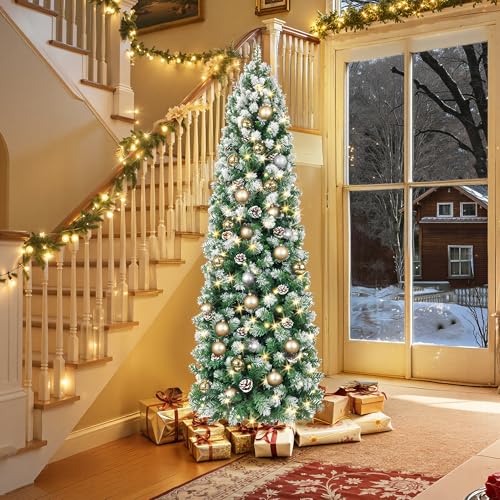 Specification: HOLLO STAR 6 ft Prelit Christmas Tree with 233 LED Lights, App Control, Slim Pencil Christmas Tree, Multi-Color RGBW Lights, 588 Flocked Frosted Tips, Xmas Tree, 51 Pine Cones, for Home, Party