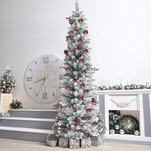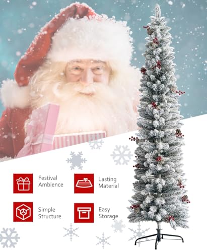 Specification: KTKDE 6ft Snow Flocked Artificial Pencil Christmas Tree, Snow Unlit Slim Xmas Tree with 30 Pine Cones & 30 red Fruits, Metal Stand, for Indoor Holiday Home Office Décor