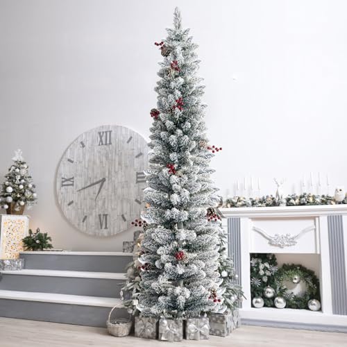 Flocked Pencil Christmas tree stands 6 feet tall with flocked branches that add a winter feel to any setting;OVERALL DIMENSIONS: 26″(Dia) x 72″(H) (including stand) Full Pencil Shape Full With 368 branch tips,30 red berries & 30 Pine Cones. You don’t even need to decorate if you want. Just pop it up as is!