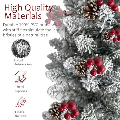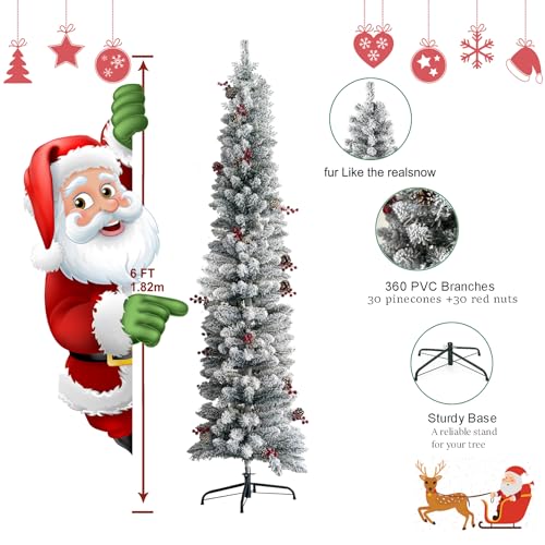 KTKDE 6ft Snow Flocked Artificial Pencil Christmas Tree, Snow Unlit Slim Xmas Tree with 30 Pine Cones & 30 red Fruits, Metal Stand, for Indoor Holiday Home Office Décor