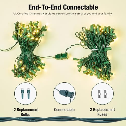 Durable and Sturdy Design: Different from other mesh net lights with weakly and very thin wires, they usually break apart easily when use in bushes or trees. We use the high quality and durable green wires. The strong construction makes it tough and sturdy, not easy to break apart and overheat after long hours of usage. They are strong enough to provide years of high quality lighting. We also provide 2 spare bulbs and 2 spare fuse for repair (basically no need to use).
