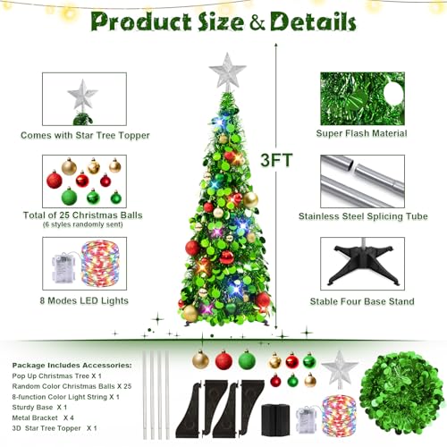 What Will You Get: 1pcs 3ft pop-up Christmas trees, 25pcs colorful Christmas hanging balls, 1pcs Christmas tree top stars, and 1pcs packaging boxes. You can easily DIY decorate the Christmas tree, making it beautiful and full!