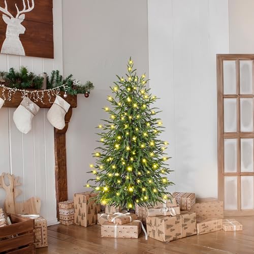 Waipfaru 4FT Christmas Tree with Lights, Real Touch Norfolk Pine Tree, Artificial Cypress Christmas Tree Potted, Xmas Tree for Indoor Outdoor Home Front Porch Christmas Decor